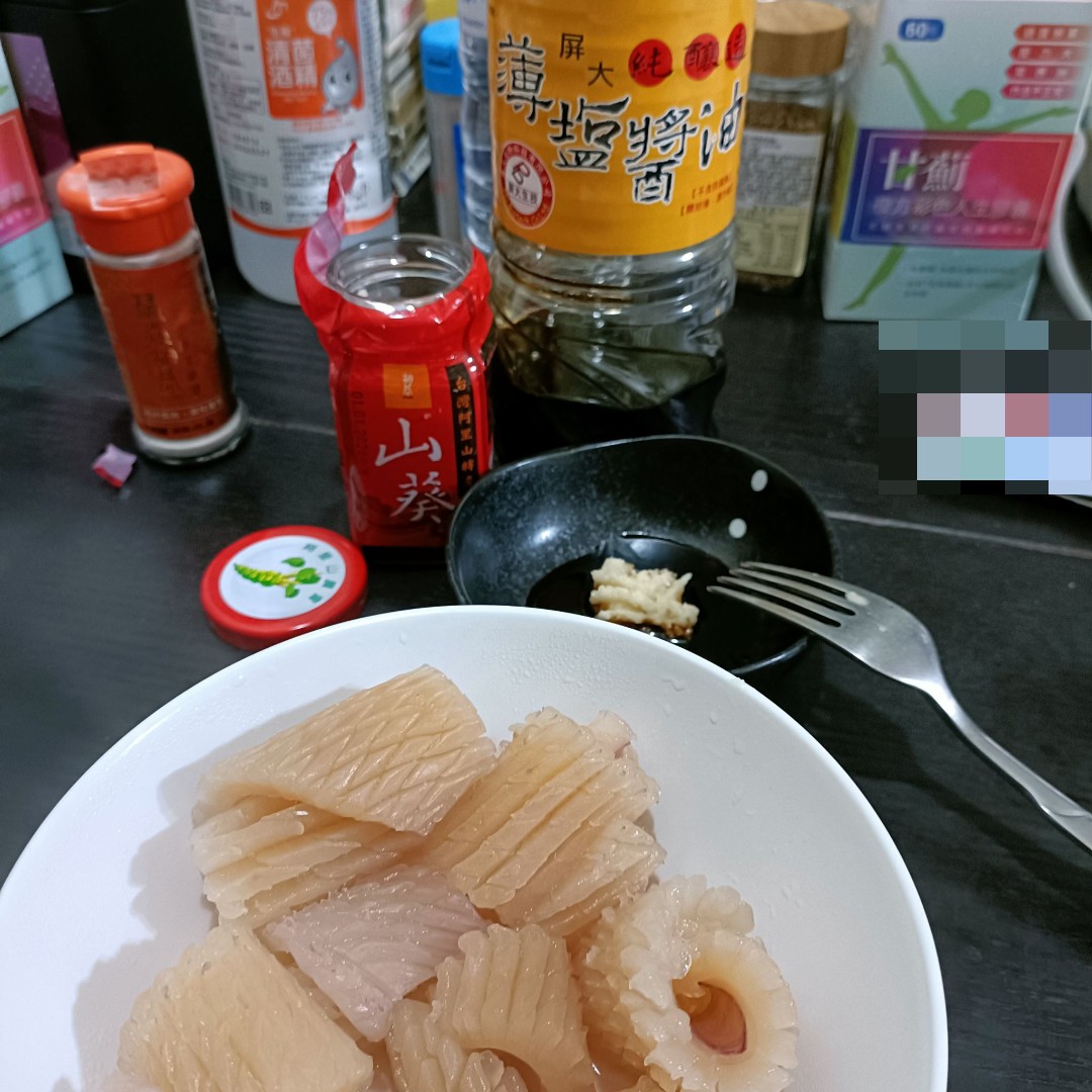 宵夜還是在家裡自己弄來吃最舒服。 這幾罐醬料真的是我的心頭好,刻花魷魚是全聯買的,胡同燒肉的阿里山 -山葵醬(他這一款很奇特是白色的,因為他已經把綠色的皮削掉了)超級辣超好吃,胡同燒肉的胡椒鹽,屏科大的薄鹽醬油,魷魚先灑一些胡椒鹽,再沾著山葵醬油一起吃就是一個字,爽。