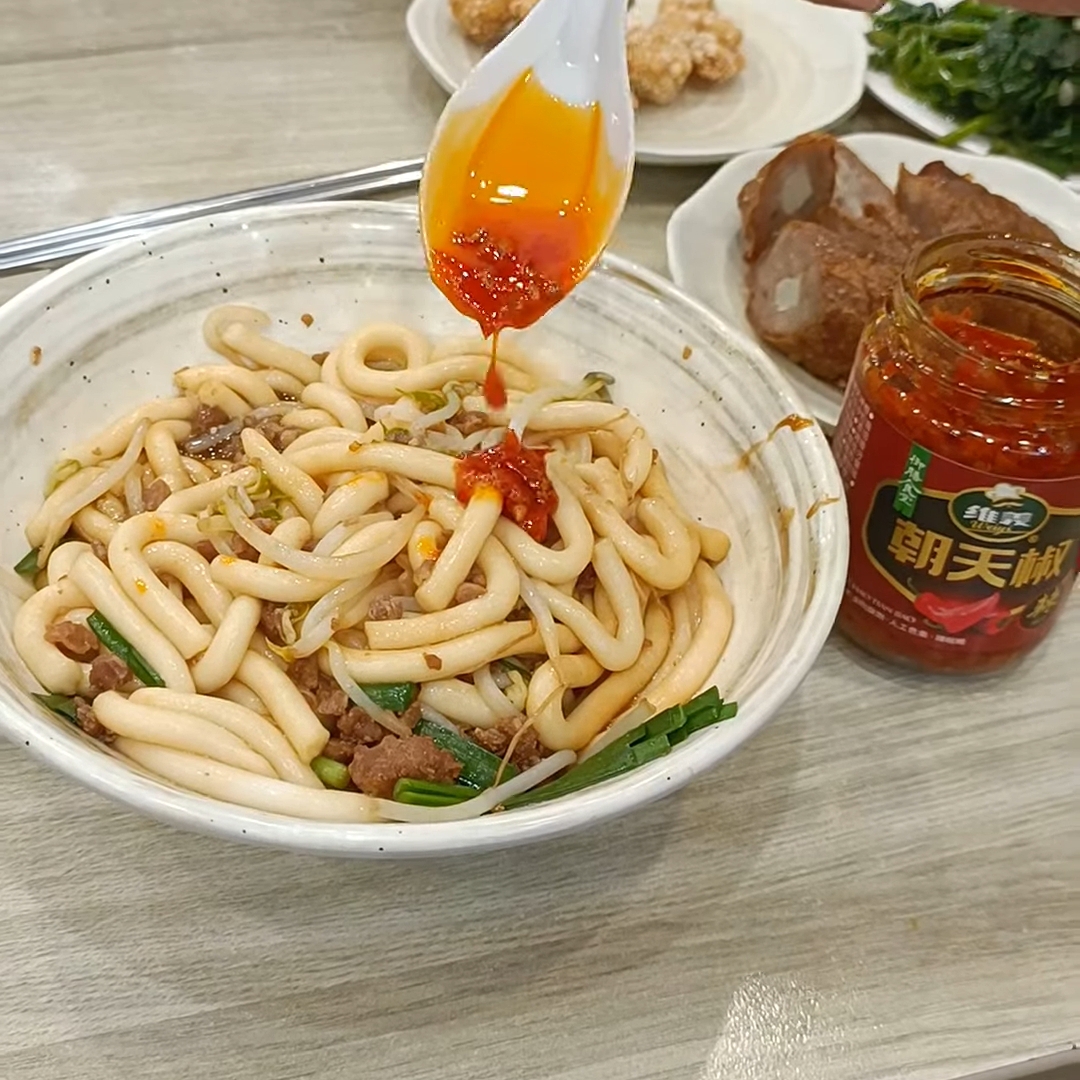 火爆椒麻陽春麵搭配上鵝油辣椒,爽 陽春麵一定要煮硬,加豆芽,青蔥,肉燥,原本的醬汁,再加上充滿濃郁香氣的鵝油辣椒,中山區好棒。
