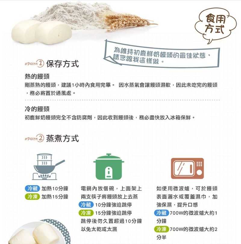 ・冷的饅頭: 初鹿鮮奶饅頭完全不含防腐劑,因此收到饅頭後,務必盡快放入冰箱保鮮。