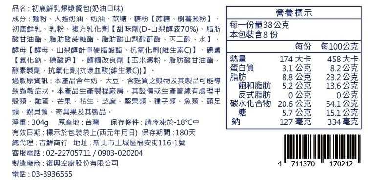 本產品含牛奶、大豆、含麩質之穀物及其製品可能導致過敏症狀