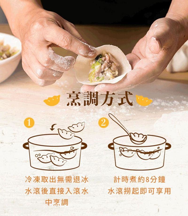 待水滾後加半碗冷水→待第二次水滾水餃浮起即可食用。