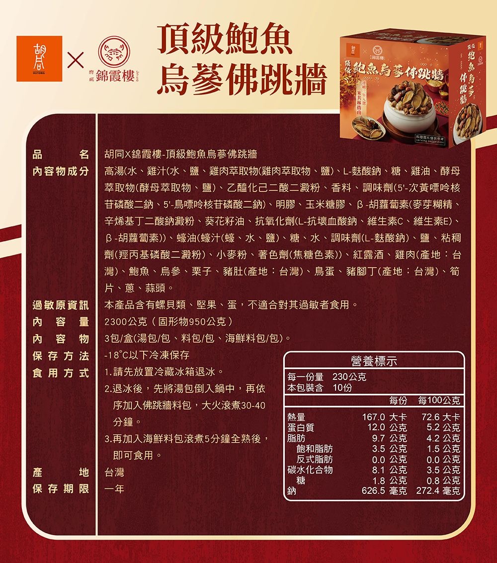 成分:高湯(水、雞汁(水、鹽、雞肉萃取物 (雞肉萃取物、鹽) 、L-麩酸鈉、糖、雞油、酵母萃取物(酵母萃取物、鹽)、乙醯化己二酸二澱粉、香料、調味劑(5′-次黃嘌呤核苷磷酸二鈉、5′-鳥嘌呤核苷磷酸二鈉)、明膠、玉米糖膠、β-胡蘿蔔素(麥芽糊精、辛烯基丁二酸鈉澱粉、葵花籽油、抗氧化劑(L-抗壞血酸鈉、維生素C、維生素E)、β-胡蘿蔔素))、蠔油(蠔汁(蠔、水、鹽)、糖、水、調味劑(L-麩酸鈉)、鹽、粘稠劑(羥丙基磷酸二澱粉)、小麥粉、著色劑(焦糖色素))、紅露酒(米、紅麴、精製食用酒精)、雞肉(產地:台灣)、鮑魚、烏參、栗子、豬肚(產地:台灣)、鳥蛋、豬腳丁(產地:台灣)、筍片、蔥、蒜頭