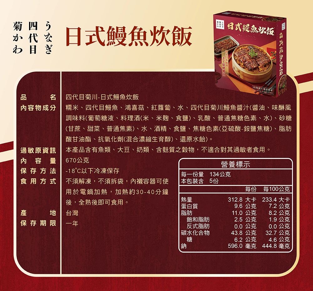 成分:糯米、四代目鰻魚、鴻禧菇、紅蘿蔔、水、四代目菊川鰻魚醬汁(醬油、味醂風調味料(葡萄糖液、料理酒(米、米麴、食鹽)、乳酸、普通焦糖色素、水)、砂糖(甘蔗、甜菜、普通焦糖色素)、水、酒精、食鹽、焦糖色素(亞硫酸-銨鹽焦糖)、脂肪酸甘油酯、抗氧化劑(混合濃縮生育醇)、還原水飴)