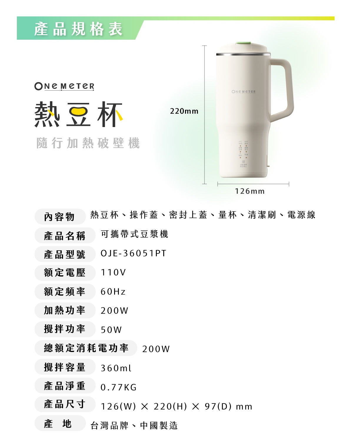 ・配件:主機x1、飲用杯蓋x1、操作用杯蓋x1、量杯x1、清潔刷x1、電源線x1、說明書x1