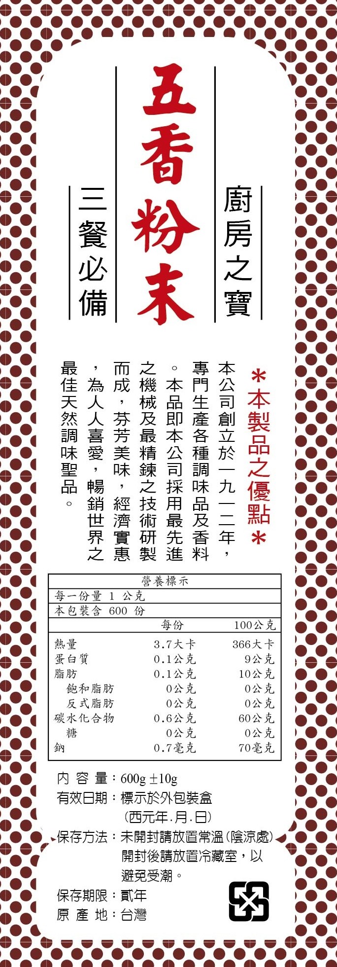 首頁 常溫美食 【老公仔標】A – 五香粉末( 600g / 盒 ) SALE 【老公仔標】A – 五香粉末( 600g / 盒 )NT$ 389 原始價格:NT$ 389。NT$ 299目前價格:NT$ 299。 🚛 全館免運 | 0 元宅配到府 登入並購買此商品可獲得 6 鬍幣,下次即可折抵 NT$ 6🌟 今日加碼!再享額外 6 鬍幣(下次可折抵 NT$ 6) 【老公仔標】A - 五香粉末( 600g / 盒 ) 數量 加入購物車 分類: 常溫美食, 油品 / 調味料, 辣椒博物館 描述 ・製造日期/有效期限,商品成分皆標示於包裝盒上 ・產品文案若有變動敬請參照實際商品為準 ・部分品項新包裝替換中,包裝隨機出貨,以實際商品為準 點這裡查看所有商品 點這裡加入私密社團掌握最新特價資訊 加入食神鬍子哥粉絲專頁,隨時掌握更多美食資訊! 您可能也喜歡… SALE 【老公仔標】調味香料粉( 300 g / 盒 ) NT$ 337 原始價格:NT$ 337。NT$ 259目前價格:NT$ 259。 加入購物車 6 鬍幣 SALE 【老公仔標】 純白椒粉(600g / 盒 ) NT$ 727 原始價格:NT$ 727。NT$ 559目前價格:NT$ 559。 加入購物車 12 鬍幣 SALE 【胡同燒肉】猛一蒜(椒鹽) NT$ 210 原始價格:NT$ 210。NT$ 189目前價格:NT$ 189。 加入購物車 4 鬍幣 SALE 【老公仔標】 粗烏椒粉 × 6 瓶( 34 g / 瓶 ) NT$ 389 原始價格:NT$ 389。NT$ 299目前價格:NT$ 299。 加入購物車 6 鬍幣 相關商品 SALE 【極之好味】潮州辣椒醬(250g / 罐) NT$ 364 原始價格:NT$ 364。NT$ 280目前價格:NT$ 280。 加入購物車 6 鬍幣 SALE 【老公仔標】 咖哩粉 × 6 瓶( 25 g / 瓶 ) NT$ 337 原始價格:NT$ 337。NT$ 259目前價格:NT$ 259。 加入購物車 6 鬍幣 【東泉】辣椒醬(420ml / 瓶) NT$ 100 NT$ 65 加入購物車 2 鬍幣 SALE 【維義】御膳食堂蒜蓉朝天辣椒(170g / 罐) NT$ 130 原始價格:NT$ 130。NT$ 100目前價格:NT$ 100。 加入購物車 2 鬍幣