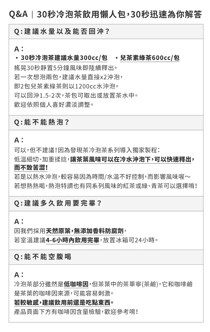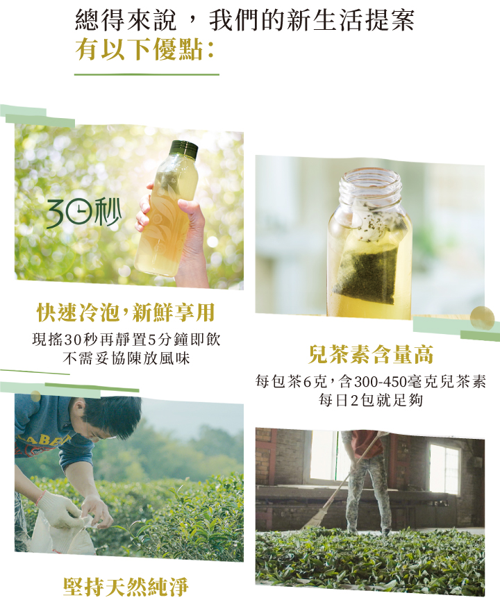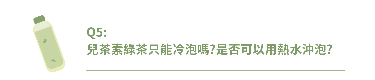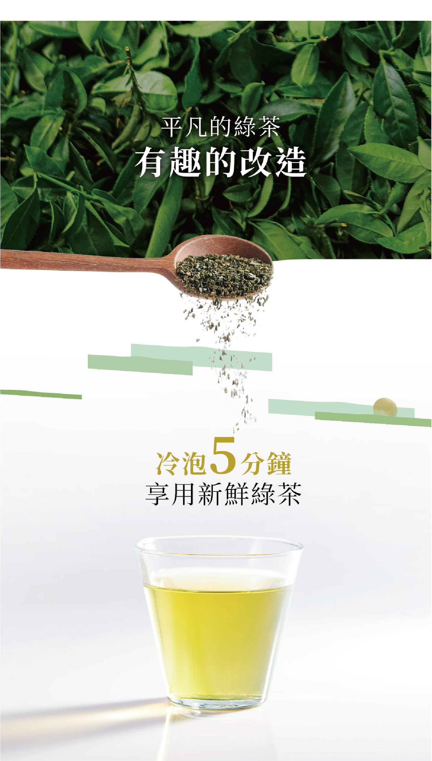 1「香料防腐劑 & 不新鮮的風味」:只要使用新鮮茶葉沖泡就可以解決;但現在哪有人有空慢慢泡茶呢? 所以如何輕鬆快速的沖泡,可以喝到一杯天然甘甜的冷泡綠茶,是我們首要之務!