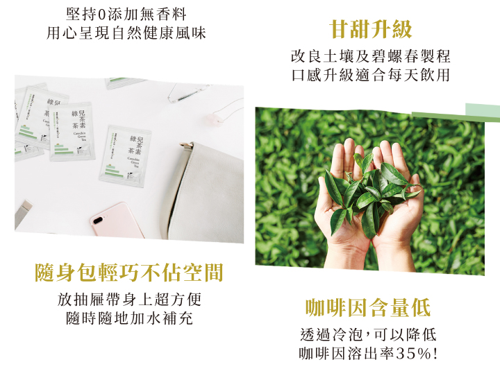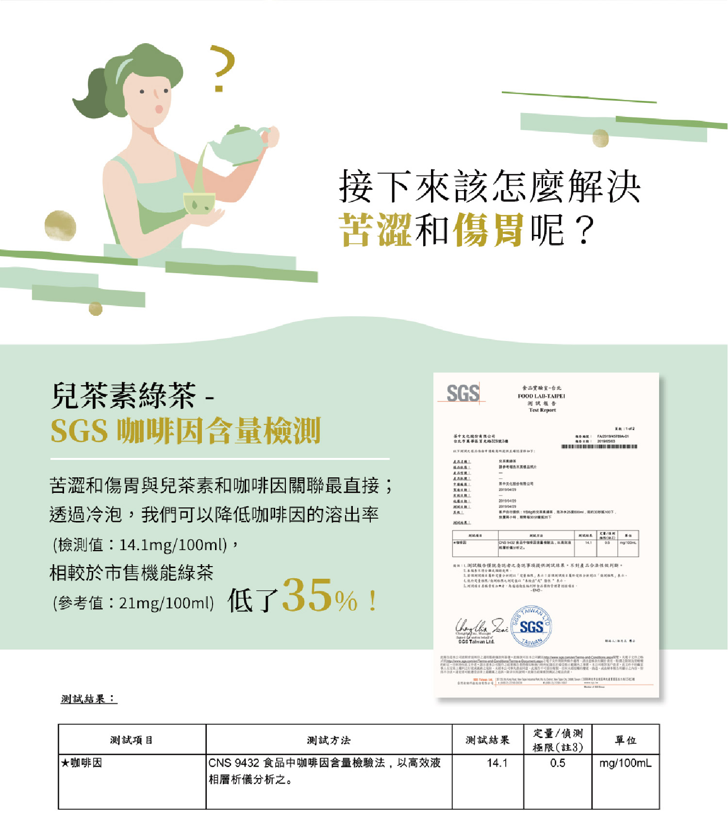 2「苦澀」甚至是「傷胃」:苦澀的來源是兒茶素和咖啡因,不應降低兒茶素健康成份的含量,但我們可以減少「咖啡因」並增加「茶葉的胺基酸」比例,就可以讓茶更甘甜而減少苦澀感,也更可以接受每日飲用!