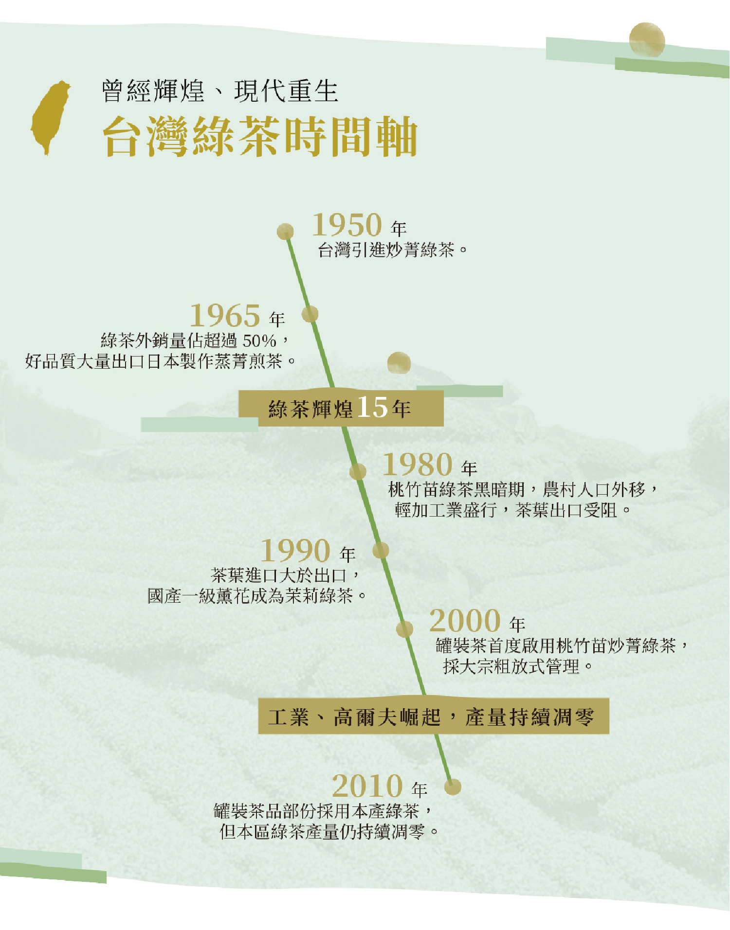 曾經台灣所產製的綠茶佔茶葉外銷產量的 50%,甚至桃竹苗產區還曾做出高品質煎茶,出口日本;然而近二十年來台灣純飲綠茶不受重視,罐裝茶飲也僅有部份原料採用本地產製,在粗放式管理下產區凋零很嚴重,品質亦不如當年。