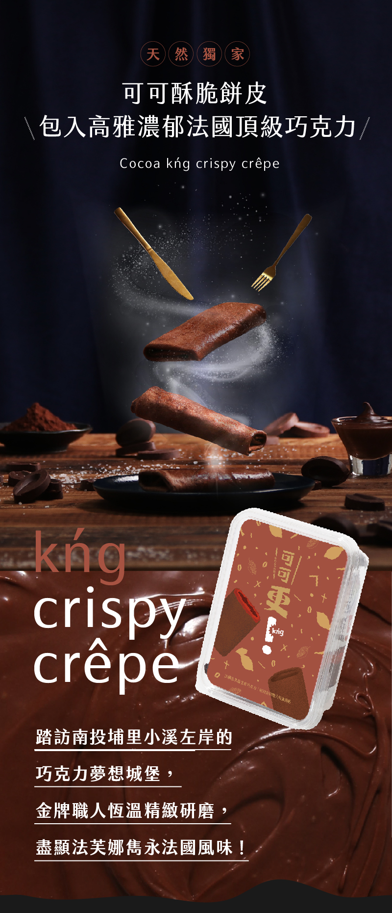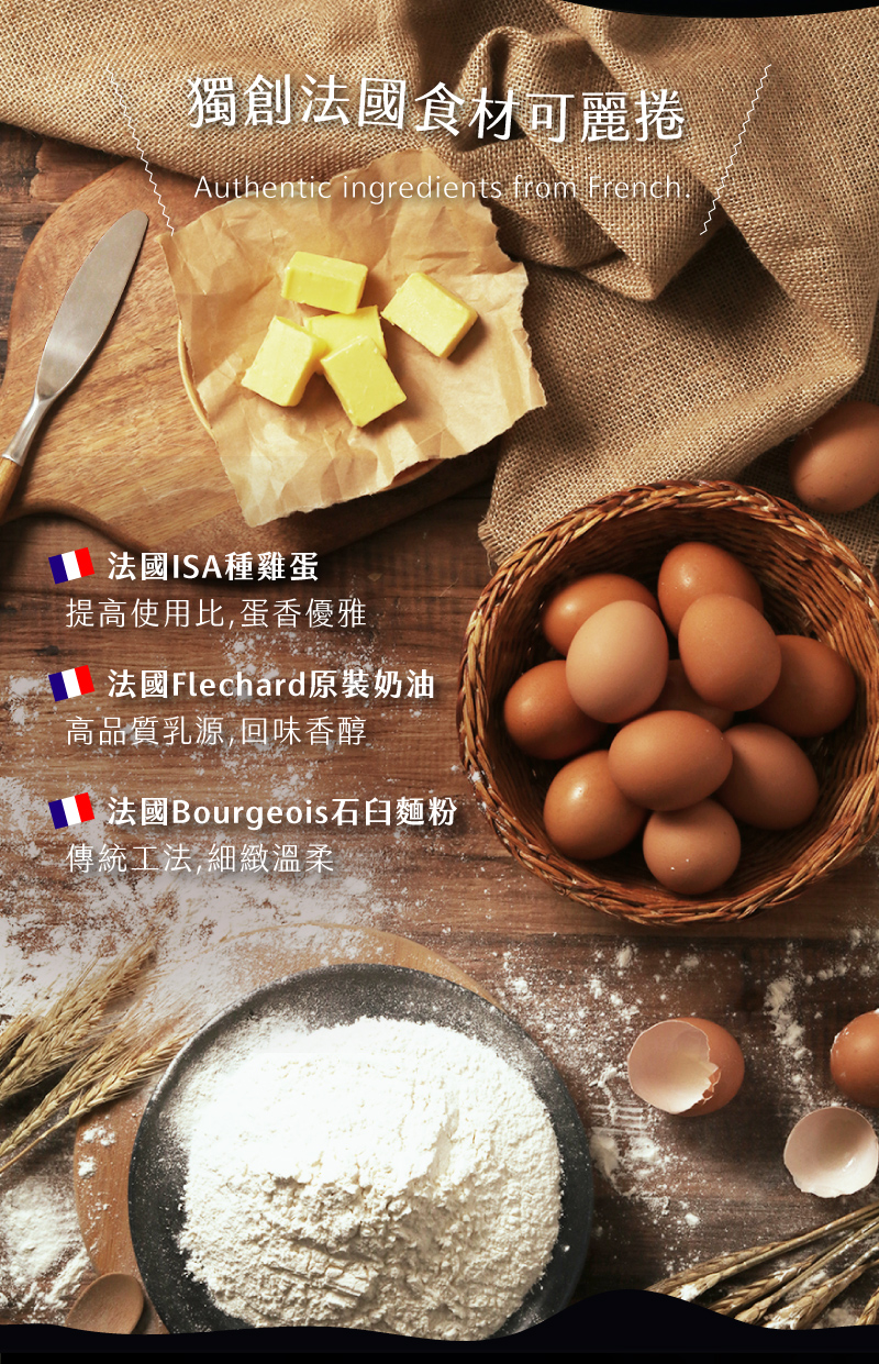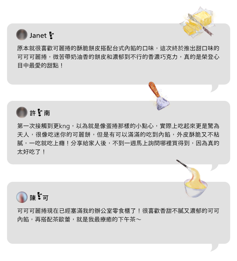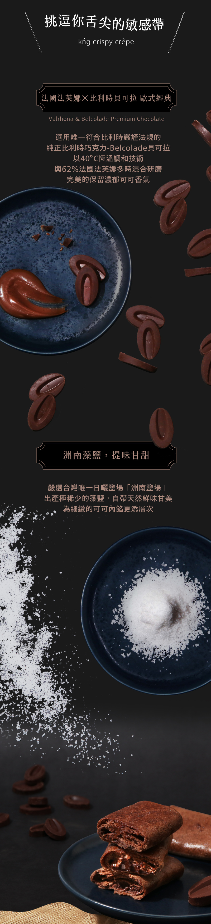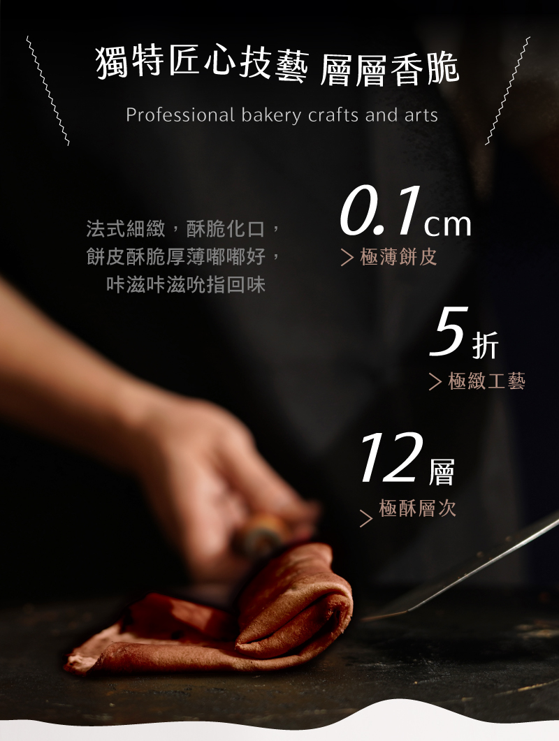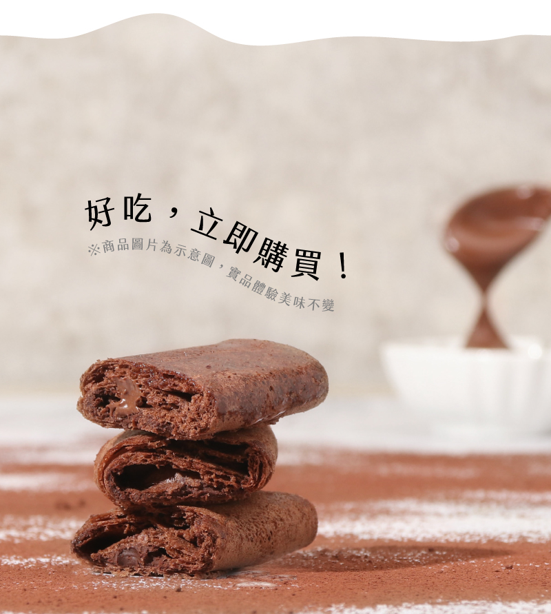 ・添加高比例可可粉呈現苦甜滋味,濃郁不酸的高雅底韻混合奶油香氣,讓酥脆可可餅皮在口感與風味都更添層次!